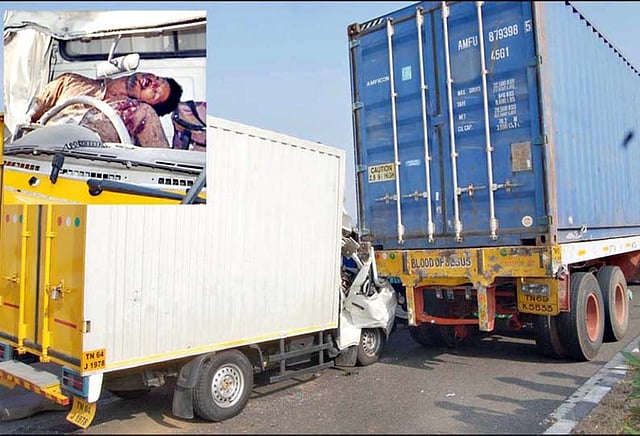 மதுரையில் இருந்து சேலத்துக்கு ஐஸ்கிரீம் ஏற்றிக்கொண்டு மினிவேன் ஒன்று சென்று கொண்டிருந்தது. அந்த மினிவேனை மதுரையை சேர்ந்த ஸ்ரீராம் (வயது 28) என்பவர் ஓட்டினார். வேடசந்தூர்-கரூர் 4 வழிச்சாலையில் விருதலைப்பட்டி மேம்பாலத்தில் மினிவேன் சென்றுகொண்டிருந்தது.அப்போது முன்னால் சென்ற கன்டெய்னர் லாரி திடீரென பிரேக் போட்டு நின்றதாக கூறப்படுகிறது. இதனால் பின்னால் வேகமாக வந்த மினிவேன் கன்டெய்னர் லாரி மீது பயங்கரமாக மோதியது. இதில் மினிவேனின் முன்பகுதி அப்பளம் போல் நொறுங்கியது. இடிபாடுகளில் சிக்கி ஸ்ரீராம் உடல்நசுங்கி இருக்கையிலேயே பிணமானார்.