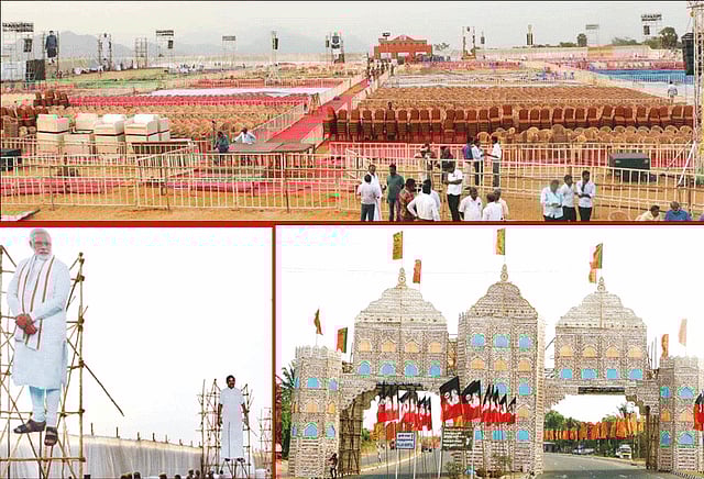 விழா நடைபெறும் இடத்தில் பிரம்மாண்ட மேடை அமைக்கப்பட்டு இருக்கிறது. மேடையில் பெரிய எல்.இ.டி. திரையும் வைக்கப்பட்டு இருக்கிறது. மொத்தத்தில் மோடி வருகையால் குமரி மாவட்டம் விழாக்கோலம் பூண்டுள்ளது.