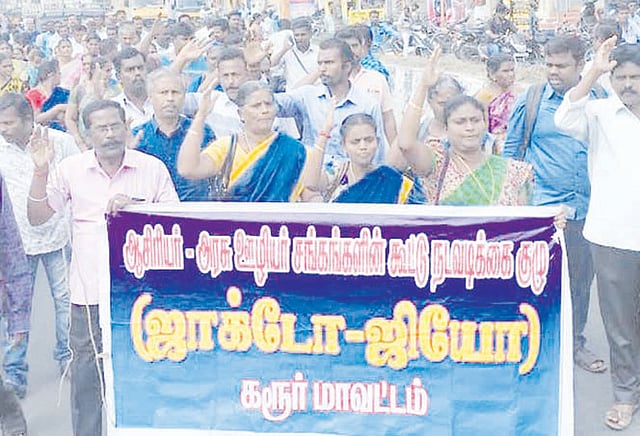 பழைய ஓய்வூதிய திட்டத்தை அமல்படுத்த வேண்டும், தொடக்க பள்ளிகளை உயர்நிலை-மேல்நிலை பள்ளிகளுடன் இணைப்பதை கைவிட வேண்டும், இடைநிலை ஆசிரியர்களுக்கு மத்திய அரசுக்கு இணையான ஊதியம் வழங்கிட வேண்டும் என்பன உள்ளிட்ட 9 அம்ச கோரிக்கைகளை வலியுறுத்தி கரூரில் கடந்த 22-ந்தேதியிலிருந்து அரசு ஊழியர்கள் மற்றும் ஆசிரியர்கள் (ஜாக்டோ-ஜியோ) வேலை நிறுத்த போராட்டத்தில் ஈடுபட்டனர். இதனால் பள்ளிகளை நடத்த முடியாத சூழல் ஏற்பட்டதால், மாணவ-மாணவிகள் கடும் பாதிப்புக்குள்ளாகினர். இந்த நிலையில் அவர்களுக்கு மாற்று ஏற்பாடாக, தற்காலிக ஆசிரியர்களை நியமிப்பதற்கான ஏற்பாடுகள் நடந்தன. இது தொடர்பாக கரூரில் இடைநிலை, படடதாரி, பி.எட் முடித்த ஆசிரியர்களிடமிருந்து சுமார் 3 ஆயிரம் விண்ணப்பங்கள் வரபெற்றுள்ளன. மேலும் மறியலில் ஈடுபட்ட 14 ஆசிரியர்கள் மற்றும் ஒரு அரசு ஊழியர் உள்பட 15 பேரை பணியிடைநீக்கம் செய்து நடவடிக்கை எடுக்கப்பட்டது. மேலும் இனியும் வேலை நிறுத்த போராட்டம் தொடரும் எனில் சம்பந்தப்பட்ட ஆசிரியர்கள் பணியாற்றும் இடம், காலியிடமாக அறிவிக்கப்படும் என அரசு அறிவித்தது.