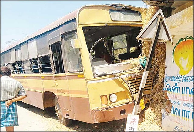 செஞ்சியில் இருந்து வெடால் கிராமத்திற்கு நேற்று காலை அரசு டவுன் பஸ் ஒன்று புறப்பட்டது. பஸ்சில் 50-க்கும் மேற்பட்ட பயணிகள் பயணம் செய்தனர். இந்த பஸ் நெகனூர் கிராமத்தில் உள்ள வளைவில் திரும்பியபோது, அந்த வழியாக வந்த மோட்டார் சைக்கிள் மீது மோதாமல் இருப்பதற்காக, டிரைவர் பஸ்சை நேராக ஓட்டினார்.