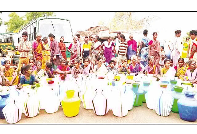 தற்போது நிலவிவரும் கடுமையான வறட்சியால் ஆழ்குழாய் கிணறுகளிலும் தண்ணீர் இல்லாததால் குடிக்கக்கூட தண்ணீர் இன்றி மக்கள் கடும் சிரமத்திற்கு ஆளாகி வருகின்றனர். இதுதொடர்பாக சம்பந்தப்பட்ட அதிகாரிகளிடம் வலியுறுத்தியும் எந்தவித நடவடிக்கையும் எடுக்கப்படவில்லை என்று கூறப்படுகிறது. ஏற்கனவே, கிராமப்பகுதிகளில் மக்களிடம் குறைகளை கேட்க வந்த தம்பிதுரை, கலெக்டர் ஆகியோரிடம் முறையிட்டும் இதுவரை குடிநீர் தட்டுப்பாடு தீர்க்கப்படவில்லை.