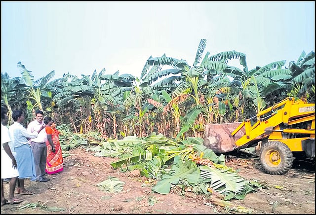 அரசு நிலம் 4 ஏக்கரில் பயிரிட்டிருந்த வாழை மரத்தை பொக்லைன் எந்திரம் மூலம் அகற்றி ரூ.20 கோடி மதிப்புள்ள அரசு நிலத்தை மீட்டனர். மீதமுள்ள 2 ஏக்கர் நிலத்தில் நெல் பயிரிட்டிருந்த நிலையில் அறுவடைக்கு தயாராக இருப்பதை அறிந்து அறுவடை முடிந்த உடன் அந்த நிலமும் மீட்கப்படும் என்று அதிகாரிகள் தெரிவித்தனர்.