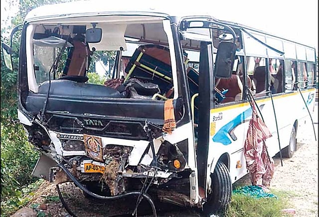 ஆந்திர மாநிலம் சித்தூர் மதனமேடு பகுதியை சேர்ந்தவர் தசரய்யா(வயது 66). அய்யப்ப பக்தரும் குருசாமியுமான இவர் தனது தம்பி ராமகிருஷ்ணன்(62) மற்றும் அதேபகுதியை சேர்ந்த முனிகிருஷ்ணன்(30), குருவப்பா(40) உள்பட 39 பேருடன் ஒரு பஸ்சில் கடந்த 8-ந்தேதி சபரிமலைக்கு சென்றார். பின்னர் அவர்கள் அனைவரும் சாமி தரிசனம் செய்து விட்டு நேற்று முன்தினம் சொந்த ஊருக்கு புறப்பட்டனர். பஸ்சை சித்தூரை சேர்ந்த பாபு என்பவர் ஓட்டினார். மாற்று டிரைவராக முருகன் என்பவர் உடன் வந்தார். அந்த பஸ் நேற்று முன்தினம் நள்ளிரவு 12.30 மணியளவில் விழுப்புரம் மாவட்டம் திண்டிவனம் அடுத்த ஜக்காம்பேட்டை ஒருங்கிணைந்த நீதிமன்றம் அருகே சென்று கொண்டிருந்தது.
