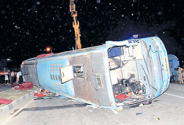 அப்போது திடீரென டிரைவரின் கட்டுப்பாட்டை இழந்த பஸ் சாலையின் நடுவில் இருந்த தடுப்பில் மோதி நடுரோட்டில் கவிழ்ந்தது. இதில் இடிபாடுகளுக்குள் சிக்கி தூத்துக்குடி மாவட்டம் உடன்குடியை சேர்ந்த ஜெகதாம்பிகை (வயது 47), தூத்துக்குடி பாரதிநகரை சேர்ந்த முகேஷ் ராஜா (8) ஆகியோர் சம்பவ இடத்திலேயே பலியானார்கள்.