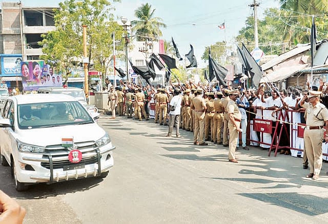 தமிழக கவர்னர் பன்வாரிலால் புரோகித் ஒவ்வொரு மாவட்டமாக நேரில் சென்று ஆய்வு மேற்கொண்டு வருகிறார். இது மாநில உரிமைகளை பறிக்கும் செயல் என எதிர் கட்சியினர் எதிர்ப்பு தெரிவித்து வருகின்றனர். இந்த நிலையில் நாகை மாவட்டத்தில் கவர்னர் பன்வாரிலால் புரோகித் தூய்மை இந்தியா திட்ட பணிகளை பார்வையிட்டார். மேலும் ரேஷன் கடை, திடக்கழிவு மேலாண்மை உரப்பூங்கா ஆகியவற்றில் ஆய்வு மேற்கொண்டார். முன்னதாக இந்த ஆய்வு மேற்கொள்வதற்காக நாகை சுற்றுலா மாளிகையில் இருந்து கவர்னர் பன்வாரிலால் புரோகித் காரில் புறப்பட்டு வந்தார். வெளிப்பாளையம் ஏழைப்பிள்ளையார் கோவில் அருகில் கவர்னர் கார் வந்தபோது, அங்கே கூடியிருந்த நாகை தெற்கு மாவட்ட தி.மு.க. மற்றும் விடுதலை சிறுத்தைகள் கட்சியினர் அவருக்கு கருப்புக்கொடி காட்டி ஆர்ப்பாட்டம் செய்தனர். மேலும், கவர்னருக்கு எதிராக பல்வேறு கோஷங்களை எழுப்பினர்.