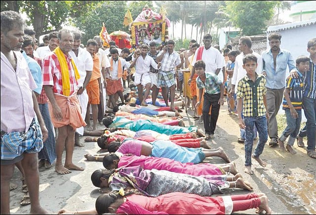 புதூரில் இருந்து இக்கரை தத்தப்பள்ளி காலனியில் உள்ள பட்டத்தரசி அம்மன் கோவிலுக்கு சப்பரம் எடுத்து செல்லப்பட்டது. அப்போது அந்த பகுதியில் உள்ள ஏராளமான பக்தர்கள் தேங்காய், பழம் படைத்து அம்மனை வழிபட்டார்கள். இதைத்தொடர்ந்து சப்பரம் திருவீதி உலா புறப்பட்டது. உடனே அந்த பகுதியை சேர்ந்த ஆண்கள், பெண்கள், சிறுவர், சிறுமிகள் என சுமார் 200 பேர் நேர்த்திக்கடனுக்காக சப்பரத்தின் முன்பு குப்புற படுத்துக்கொண்டார்கள்.