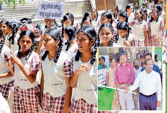 ராமநாதபுரம் ராஜா தினகர் ஆர்.சி. உயர்நிலைப்பள்ளியில் உலக சுற்றுச்சூழல் தினத்தையொட்டி தமிழ்நாடு சுற்றுச்சூழல் துறை மற்றும் தேசிய பசுமைப்படை ஆகியவற்றின் சார்பில் பிளாஸ்டிக் மாசுவை முறியடிப்போம் என்ற கருத்தை வலியுறுத்தி விழிப்புணர்வு பேரணி நடைபெற்றது. இதனை மாவட்ட கலெக்டர் நடராஜன் கொடியசைத்து தொடங்கி வைத்தார். ராஜா தினகர் உயர்நிலைப்பள்ளியில் தொடங்கிய இந்த பேரணி, சிகில் ராஜவீதி, செய்யது அம்மாள் மருத்துவமனை, வண்டிக்கார தெரு, அரண்மனை சாலை வழியாக சென்று மீண்டும் பள்ளியை அடைந்தது. இதில் மாணவ-மாணவிகள் 900-க்கும் மேற்பட்டோர் கலந்துகொண்டு பிளாஸ்டிக் தவிர்ப்போம், மண்வளம் காப்போம், மரம் வளர்ப்போம் என்பது போன்ற வாசகங்கள் அடங்கிய அட்டைகளை கையில் ஏந்தியும், கோஷங்களை எழுப்பியும் விழிப்புணர்வு ஏற்படுத்தினர்.