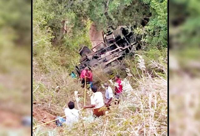 மேலும் லாரியில் இருந்து சுமார் 50 அடி தூரத்தில் அதை ஓட்டி வந்த டிரைவர் ராமசந்திரன் பலத்த காயங்களுடன் கிடந்தார். அவரை போலீசார் மீட்டு தேனி அரசு மருத்துவக்கல்லூரி மருத்துவமனைக்கு சிகிச்சைக்கு அனுப்பி வைத்தனர். அங்கு அவருக்கு தீவிர சிகிச்சை அளிக்கப்படுகிறது. பள்ளத்தில் பாய்ந்ததில் லாரி நொறுங்கி கிடந்தது. விபத்து குறித்து குரங்கணி போலீசார் வழக்குப்பதிவு செய்து விசாரணை நடத்தி வருகின்றனர்.
