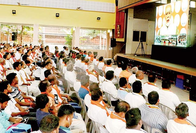 இந்த கூட்டம் மாலை 5 மணிக்கு தொடங்கியது. தொடர்ந்து 6 மணி வரை ஒரு மணி நேரம் கூட்டம் நடந்தது. கூட்டத்தில் காணொலியில் பேசிய பிரதமர் நரேந்திரமோடி, நாடாளுமன்ற தேர்தல் தொடர்பாக முக்கிய ஆலோசனைகளை வழங்கியதாக கூறப்படுகிறது. அதோடு தேர்தல் பணிகள் குறித்தும் அறிவுரைகள் வழங்கி உள்ளார். பிரதமர் நரேந்திரமோடி காணொலி காட்சியில் பேசியது அகன்ற திரையில் ஒளிபரப்பப்பட்டது.