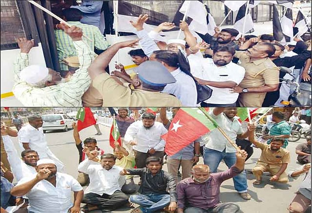 இதேபோல் ஈரோடு பன்னீர்செல்வம் பூங்கா பகுதியில் தமிழ்நாடு முஸ்லிம் முன்னேற்ற கழகத்தை சேர்ந்தவர்கள் சாலை மறியலில் ஈடுபட்டனர். அப்போது அங்கு பாதுகாப்பு பணியில் ஈடுபட்டு இருந்த ஈரோடு டவுன் போலீஸ் இன்ஸ்பெக்டர் விஜயன் தலைமையிலான போலீசார், போராட்டத்தில் ஈடுபட்டவர்களை கைது செய்து வேனில் ஏற்றினார்கள். கைது செய்யப்பட்டவர்கள் ஈரோடு மாநகராட்சி தமயந்தி பாபுசேட் திருமண மண்டபத்தில் அடைக்கப்பட்டனர். இதில் மொத்தம் 28 பேர் கைது செய்யப்பட்டனர்.