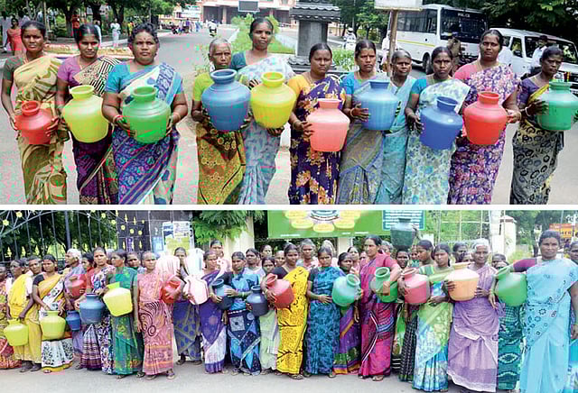 சீரான குடிநீர் வழங்கக்கோரி இரு கிராமங்களை சேர்ந்த பெண்கள் காலிக் குடங்களுடன் கலெக்டர் அலுவலகம் திரண்டு வந்ததால் பரபரப்பு ஏற்பட்டது.