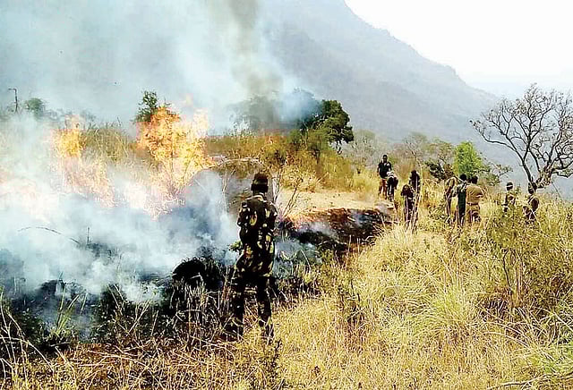 தீ சீகை மரங்களில் பற்றி எரிந்ததால் வேகமாக பரவியது. இதனால் 15 ஏக்கர் பரப்பளவு வனப்பகுதி தீயில் எரிந்து நாசமானது. தொடர்ந்து காட்டுத்தீயை அணைக்கும் பணியில் வனத்துறையினர் ஈடுபட்டு வருகின்றனர்.