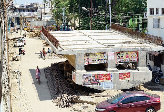 இந்த நிலையில் விரைந்து முடிக்கப்பட வேண்டிய கட்டுமான பணி பல காலக்கட்டங்களில் முடக்கம் அடைந்தும், தாமதத்துக்குள்ளாகியும் வருகிறது. ரெயில்வே துறையினர் ரெயில்பாதை பகுதியில் தங்களது கட்டுமான பணிகளை முடித்து விட்ட நிலையில் நெடுஞ்சாலைத்துறையினர் அவர்களது மேற்பார்வையில் நடைபெற்று வரும் கட்டுமானபணியை தாமதப்படுத்தி வருகின்றனர். மணல் தட்டுப்பாடு, இடுபொருட்கள் விலை உயர்வு போன்ற பல்வேறு காரணங்கள் கூறப்பட்டாலும் ராமமூர்த்தி ரோட்டில் குடிநீர் குழாய்கள் மற்றும் மின்கம்பங்கள் ஆகியவற்றை மாற்றி அமைப்பதில் நகராட்சி நிர்வாகமும், மின் வாரியமும் போதிய ஒத்துழைப்பு தரவில்லை என்று கூறப்படுகிறது. மேம்பால கட்டுமான பணியில் அனைத்து துறைகளும் ஒருங்கிணைந்து செயல்படவேண்டியது அவசியம் ஆகும்.