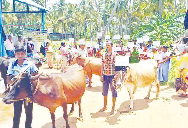 அவர்கள் மாடுகளின் கொம்பில் வாழ விடு, வாழ விடு, விவசாயிகளை வாழ விடு என எழுதிய அட்டையை கட்டி அழைத்து வந்திருந்தனர். தொடர்ந்து அவர்கள் 8 வழி பசுமை சாலை இந்த பகுதியில் வரக்கூடாது என வேண்டி, அதனை மனுவாக எழுதி அம்மன் சிலை முன் வைத்து நூதன வழிபாடு நடத்தினார்கள். இதன் பின்னர் 8 வழி பசுமை சாலை திட்டத்துக்கு எதிர்ப்பு தெரிவித்து கோவில் வளாகத்தில் மாடுகளுடன் விவசாயிகள், பெண்கள் பலர் ஆர்ப்பாட்டத்தில் ஈடுபட்டனர்.