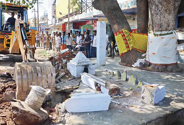 இதையடுத்து அதிகாரிகள் முன்னிலையில் ஊழியர்கள் பொக்லைன் எந்திரம் மூலம் சாலையோர ஆக்கிரமிப்புகளை அகற்றினர். அப்போது அதே பகுதியில் வேப்பமரம், அரசமரம் நடுவே இருந்த சிறிய கோவிலின் முன்பகுதி போக்குவரத்துக்கு இடையூறாக இருந்ததால் அதை இடிக்க அதிகாரிகள் முற்பட்டனர். இதற்கு அந்த பகுதி மக்கள் கடும் எதிர்ப்பு தெரிவித்தனர். இதனால் அங்கு பரபரப்பு ஏற்பட்டது.