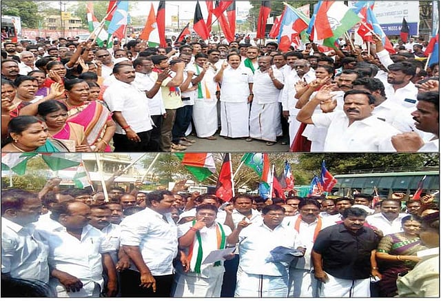 நேற்று 4-வது நாளாக சேலம் கலெக்டர் அலுவலகம் அருகே சேலம் மத்திய மாவட்ட தி.மு.க.வினர் மற்றும் கூட்டணி கட்சியினர் தி.மு.க. மாவட்ட செயலாளர் வக்கீல் ஆர்.ராஜேந்திரன் எம்.எல்.ஏ. தலைமையில் போராட்டம் நடத்திட திரண்டனர். அங்கு நடந்த ஆர்ப்பாட்டத்துக்கு மாவட்ட தி.மு.க. அவைத்தலைவர் எஸ்.டி.கலையமுதன் தலைமை தாங்கினார். பொருளாளர் ஜி.கே.சுபாசு, தலைமை செயற்குழு உறுப்பினர் சூடாமணி ஆகியோர் முன்னிலை வகித்தனர்.