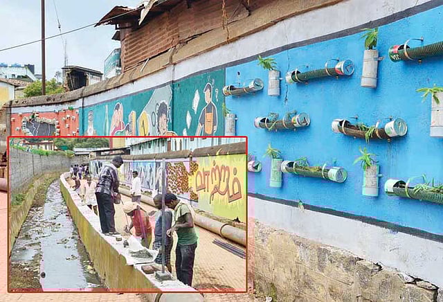 ஆகவே, மாணவர்களாகிய நாங்கள் அந்த நடைபாதை மற்றும் சாக்கடை கால்வாயை சுத்தப்படுத்தும் பணியில் ஈடுபட்டோம். கால்வாயின் ஒரு புறத்தில் இருந்து பிளாஸ்டிக் குப்பைகள் வீசுவதை தடுக்க தடுப்பு வேலி அமைக்கப்பட்டு வருகிறது. வீசப்படும் பிளாஸ்டிக் பொருட்களில் செடிகள் வளர்ப்பது குறித்து சுவரில் செயல்முறை விளக்கம் அளிக்கப்பட்டு உள்ளது. மேலும் சுவரில் தத்ரூப ஓவியங்கள் வரையப்பட்டு உள்ளன.