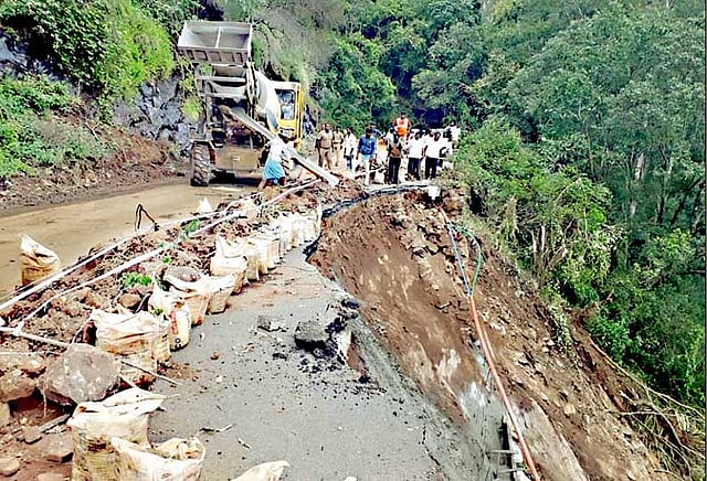 இதற்கிடையே மண்சரிவு ஏற்பட்ட இடத்தில் உள்ள பாறைகளில் எந்திரம் மூலம் துளையிடப்பட்டு, அதில் கான்கிரீட் கலவைகள் கொட்டப்பட்டன. அதனை தொடர்ந்து கான்கிரீட் கலவை கொட்டப்பட்ட இடத்தில், மணல் மூட்டைகளை அடுக்கும் பணி மாலையில் தொடங்கியது. இந்த பணி இன்று (செவ்வாய்க்கிழமை) வரை நீடிக்கும் என தெரிகிறது. மலைப்பாதை சீரமைப்பு பணிகள் முடிந்த உடன் கனரக வாகனங்கள் செல்ல அனுமதிக்கப்படும்.