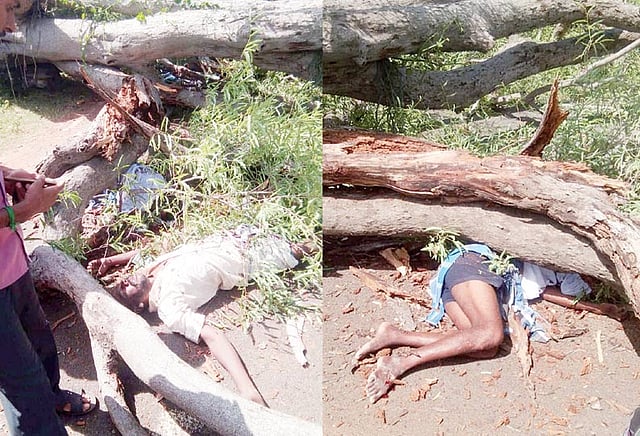 இதில் மரம் சாய்ந்து விழுந்ததில் மோட்டார் சைக்கிளில் சென்ற 2 பேர் உடல் நசுங்கி இறந்தனர்.