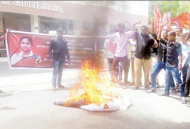 மேலும் தரையில் அமர்ந்து நீட் தேர்வுக்கு எதிராகவும், தமிழக அரசை கண்டித்தும் கோஷம் எழுப்பினர். அப்போது திடீரென முதல்-அமைச்சர் எடப்பாடி பழனிசாமி மற்றும் துணை முதல்-அமைச்சர் ஓ.பன்னீர்செல்வம் ஆகியோரின் உருவ பொம்மையை தீயிட்டு எரித்தனர்.