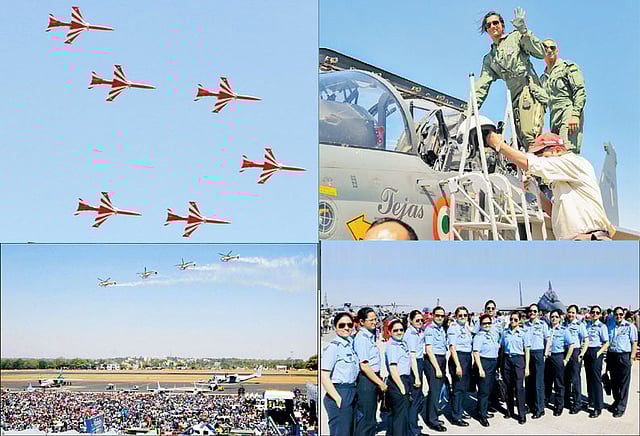இதுதவிர போர் விமானங்களில் இருந்து, இந்திய விமானப்படையைச் சேர்ந்த 8 பெண்கள் பாராசூட் மூலம் விண்ணில் பறந்தபடி கீழே குதித்து சாகசங்கள் செய்து காட்டினர். இது பார்வையாளர்களை மெய்சிலர்க்க வைத்தது. எல்லாவற்றுக்கும் மேலாக விமான கண்காட்சி தொடங்குவதற்கு முன்பாக கடந்த 19-ந் தேதி சாகச ஒத்திகையில் ஈடுபட்ட சூர்ய கிரண் என்ற 2 பயிற்சி போர் விமானங்கள் வானில் பறந்தபோது மோதிக் கொண்டன. அந்த 2 விமானங்கள் கீழே விழுந்து நொறுங்கியதுடன், ஒரு விமானி உயிர் இழந்திருந்தார். இதனால் கடந்த 3 நாட்களாக நடந்த சாகத்தில் சூர்ய கிரண் போர் விமானங்கள் இடம் பெறாமல் இருந்தன.