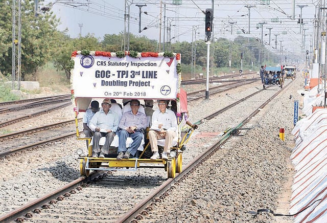 இதை தவிர்ப்பதற்காக திருச்சி-பொன்மலை இடையே புதிதாக 3-வது அகல ரெயில் பாதை அமைக்கப்பட்டது. தற்போது இந்த பணி முடிவடைந்துள்ளது. இந்த நிலையில் தஞ்சை-சோளகம்பட்டி வரை அமைக்கப்பட்ட இரட்டை அகல ரெயில் பாதையை தென் மண்டல ரெயில்வே பாதுகாப்பு ஆணையர் மனோகரன் தலைமையில் அதிகாரிகள் நேற்று அதிவேக ரெயிலில் சென்று ஆய்வு நடத்தினர்.