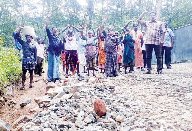 இந்த சாலையை சீரமைக்க தேவையான ஜல்லி போன்ற பொருட்கள் தடிக்காரன்கோணத்தில் உள்ள வனத்துறைக்கு சொந்தமான சோதனை சாவடி வழியாக கொண்டு செல்லவேண்டும். சோதனை சாவடியில் பணியில் இருக்கும் அதிகாரிகள் சாலையை சீரமைக்க தேவையான பொருட்களை கொண்டு செல்ல விடாமல் தடுத்து வருகிறார்கள். இதனால், சாலை பணி தொடர்ந்து முடக்கப்பட்டு வருகிறது.