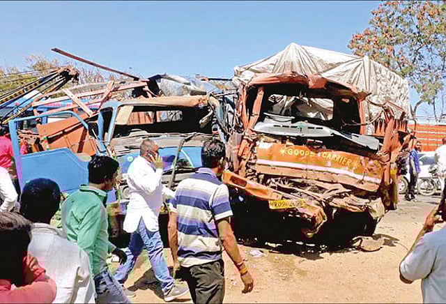 நாசிக் மாவட்டத்தில் உள்ள மும்பை- ஆக்ரா நெடுஞ்சாலையில் நாசிக்கில் இருந்து கேத்ராய் பகுதியை நோக்கி ஆட்களை ஏற்றிக்கொண்டு லாரி ஒன்று சென்று கொண்டு இருந்தது. பசோலே பாடா பகுதியை நெருங்கியபோது இந்த லாரியும் எதிரே வந்த மற்றொரு லாரியும் கண் இமைக்கும் நேரத்தில் நேருக்கு, நேர் மோதி விபத்துக்குள்ளானது. இந்த கோர விபத்தில் 2 லாரிகளும் அப்பளம் போல் நொறுங்கின. இந்த பயங்கர விபத்தில் லாரியில் இருந்த 3 பெண்கள் உள்பட 7 பேர் சாலையில் தூக்கி வீசப்பட்டு படுகாயம் அடைந்து உயிரிழந்தனர்.