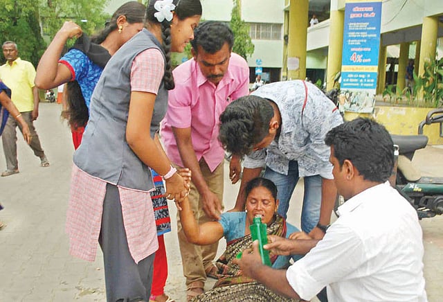ஈரோடு கனிராவுத்தர்குளம் காந்திநகரை சேர்ந்த ராஜேந்திரன். கூலித்தொழிலாளி. இவர் தன்னுடைய மனைவி சுபஸ்ரீ, மகன் மதியழகன், மகள்கள் ஜனரஞ்சனி, கலைரஞ்சனி ஆகியோருடன் ஈரோடு மாவட்ட கலெக்டர் அலுவலகத்திற்கு நேற்று வந்தார். அப்போது சுபஸ்ரீ திடீரென மயங்கி கீழே விழுந்துவிட்டார். உடனே அருகில் இருந்தவர்கள் தண்ணீரை முகத்தில் தெளித்து எழுப்பினார்கள். பின்னர் ராஜேந்திரன் தனது குடும்பத்துடன் மாவட்ட வருவாய் அதிகாரி கவிதாவை சந்தித்து மனு ஒன்றை கொடுத்தார். அந்த மனுவில் அவர் கூறி இருந்ததாவது:-