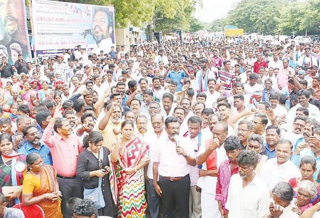 சேலம் மாவட்டம் ஆத்தூர் அருகே உள்ள தளவாய்பட்டி கிராமத்தை சேர்ந்த மாணவி ராஜலட்சுமி படுகொலை செய்யப்பட்டதை கண்டித்து சேலம் மாவட்ட விடுதலை சிறுத்தைகள் கட்சி சார்பில் சேலம் கோட்டை மைதானத்தில் நேற்று ஆர்ப்பாட்டம் நடைபெற்றது. இதில் விடுதலை சிறுத்தைகள் கட்சி தலைவர் தொல்.திருமாவளவன் கலந்து கொண்டு பேசினார்.
