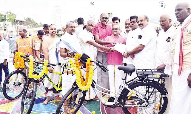 அந்தச் சைக்கிள்களை தனியார் நிறுவன பிரதிநிதிகள் வழங்க, அவைகளை கோவில் துணை அதிகாரி லோகநாதன் பெற்றுக் கொண்டார். அந்தத் தனியார் நிறுவன பிரநிதிகளுக்கு கோவிலில் சாமி தரிசன ஏற்பாடுகளை அதிகாரிகள் செய்து வைத்தனர்.
