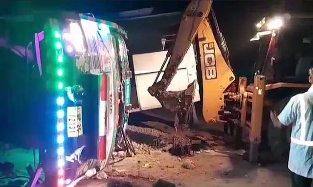 உடனடியாக போலீசாருக்கு தகவல் தெரிவிக்கப்பட்டது. இதையடுத்து சம்பவ இடத்திற்கு விரைந்து வந்த போலீசார் கிரேன்களின் உதவியுடன் விபத்தில் சிக்கியவர்களை மீட்டனர். சுமார் 3 மணி நேரத்திற்கும் மேலாக மீட்பு பணிகள் நடைபெற்றன. இந்த விபத்தில் 11 பேர் பரிதாபமாக உயிரிழந்தனர். மேலும் 10 பேர் காயமடைந்தனர். காயமடைந்தவர்கள் மீட்கப்பட்டு அருகில் உள்ள மருத்துவமனைக்கு அனுப்பி வைக்கப்பட்டனர். இந்த விபத்து தொடர்பாக போலீசார் வழக்குப்பதிவு செய்து விசாரணை மேற்கொண்டு வருகின்றனர்.