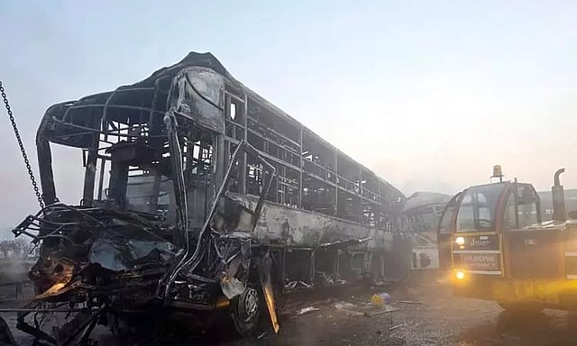 8 பஸ்கள், 3 கார்கள், வேன்கள் என பல வாகனங்கள் அடுத்தடுத்து மோதி தீப்பற்றி எரிந்தன. இந்த விபத்தில் 4 பேர் உயிரிழந்த நிலையில் பலி எண்ணிக்கை 13 ஆக அதிகரித்துள்ளது. மேலும், விபத்தில் 75 பேர் படுகாயங்களுடன் மீட்கப்பட்டு சிகிச்சைக்காக அருகில் உள்ள மருத்துவமனையில் அனுமதிக்கப்பட்டுள்ளனர்.