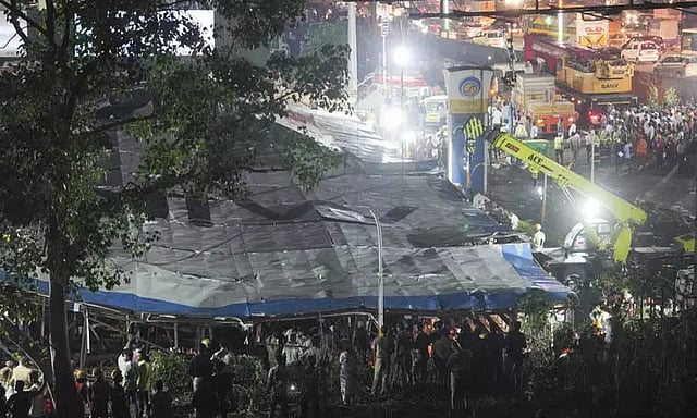 இந்நிலையில், நேற்று மாலை வீசிய புழுதிப்புயலில் விளம்பர பதாகை இரும்பு சாரங்களுடன் சரிந்து விழுந்தது. இதில் பெட்ரோல் பங்க் மற்றும் அருகில் இருந்த வீடுகள் நொறுங்கின. மேலும், இந்த சம்பவத்தில் விளம்பர பதாகைக்குள் பலர் சிக்கிகொண்டனர். விரைந்து வந்த போலீசார் மற்றும் மீட்புக்குழுவினர் விளம்பர பதாகைக்குள் சிக்கியவர்களை மீட்கும் பணியில் ஈடுபட்டனர். இந்த சம்பவத்தில் நேற்று 9 பேரின் சடலங்கள் மீட்கப்பட்டன.