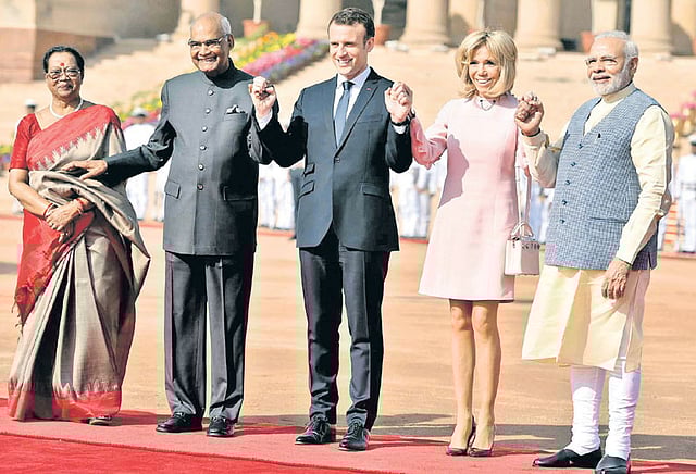 நேற்று காலை ஜனாதிபதி மாளிகையில் மேக்ரானுக்கு சிவப்பு கம்பள வரவேற்பும் ராணுவ அணிவகுப்பு மரியாதையும் அளிக்கப்பட்டது. அவரையும், அவருடைய மனைவியையும் ஜனாதிபதி ராம்நாத் கோவிந்தும், பிரதமர் மோடியும் வரவேற்றனர்.