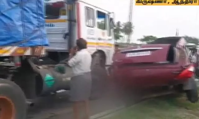 ஆந்திரா மாநிலம் கிருஷ்ணா மாவட்டம், பாப்புலபாடு தேசிய நெடுஞ்சாலையில் இன்று காலை, லாரி மீது அதிவேகத்தில் வந்த கார் ஒன்று பயங்கரமாக மோதி விபத்துக்குள்ளானது. இந்த கோர விபத்தில் காரில் பயணித்த 4 பேர் உடல் நசுங்கி உயிரிழந்தனர்.