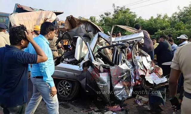 அந்த சமயத்தில் விஜயநகர் புறநகரில் சுரங்கபாதை அருகே கார் வந்து கொண்டிருந்தது. அதே நேரத்தில் அதே சாலையில் எதிரே வேகமாக வந்த டிப்பர் லாரியின் ஸ்டிரீயங் முறிந்தது. இதனால் டிப்பர் லாரி கட்டுப்பாட்டை இழந்து சாலை தடுப்பை உடைத்துக்கொண்டு சாலையின் மறுபுறம் ஓடி 13 பேர் பயணித்த கார் மீது நேருக்குநேர் பயங்கரமாக மோதியது. மோதிய வேகத்தில் டிப்பர் லாரி, சாலையோர பள்ளத்தில் கவிழ்ந்தது. அதே சமயத்தில் விபத்தில் சிக்கிய காரின் பின்னால் மற்றொரு லாரியும் பயங்கரமாக மோதியது. இரு லாரிகளுக்கு இடையே கார் சிக்கி உருக்குலைந்து சின்னாபின்னமானது.