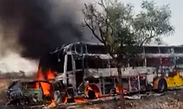 ஷாந்தாப்பூர் அருகே கார் சென்றபோது பெங்களூருவிலிருந்து குல்பர்கா நோக்கி சென்று கொண்டிருந்த தனியார் பேருந்து மீது கார் வேகமாக மோதியது. இதில் இரு வாகனங்களும் தீப்பிடித்து எரிந்து சாம்பலாயின. இதில் காரில் பயணித்த கிருஷ்ணா நாயக் (56), அவரது மனைவி ஆனந்த கலா (50), அவரது மகன் சரணப்பா (26) உட்பட 6 பேர் உயிரிழந்தனர். சரணப்பாவின் மனைவி நிசர்கா (24), மகன் சித்தார்த் (3), மகள் சசிகலா(2) ஆகிய மூவரும் மருத்துவமனைக்கு கொண்டு செல்லும் வழியில் உயிரிழந்தனர்.