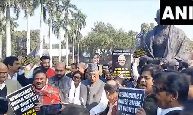 இதற்கு எதிர்ப்பு தெரிவித்து, தேசியவாத காங்கிரசின் சரத் பவார் மற்றும் காங்கிரஸ் கட்சியின் மல்லிகார்ஜுன கார்கே உள்ளிட்ட எதிர்க்கட்சி எம்.பி.க்கள் நாடாளுமன்ற வளாகத்தில் இருந்த காந்தி சிலையின் முன் இன்று போராட்டத்தில் ஈடுபட்டனர்.