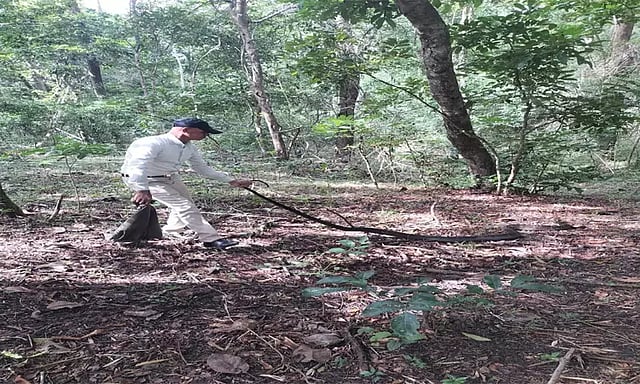 சிக்கமகளூரு மாவட்டம் மூடிகெரே தாலுகா பனகல் அருகே உள்ள காபி தோட்டத்தில் தொழிலாளர்கள் வேலை பார்த்து கொண்டிருந்தனர். அப்போது ராஜநாகம் ஒன்று காபி தோட்டத்திற்குள் சென்றதை அவர்கள் பார்த்தனர். இதுகுறித்து தொழிலாளர்கள் பாம்பு பிடி வீரர் ஆரீப்பிற்கு தகவல் கொடுத்தனர். அதன்பேரில் பாம்பு பிடி வீரர் சம்பவ இடத்திற்கு விரைந்து வந்தார். பின்னர் அங்கு சுற்றித்திரிந்த ராஜநாகத்தை ஒரு மணி நேரம் போராடி பிடித்தார். பின்னர் அந்த ராஜநாகத்தை சார்மடி மலைப்பகுதியில் விட்டார்.