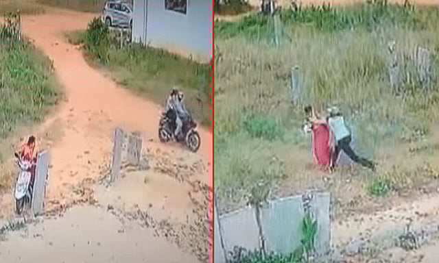 கர்நாடக மாநிலம், கோலார் மாவட்டத்தில் உள்ள சஞ்சப்பா நகரில் இருசக்கர வாகனத்தில் சென்ற பெண்ணை பின்தொடர்ந்த மர்ம நபர்கள் 2 பேர், அந்த பெண்ணிடம் நகையை பறித்த சம்பவம் பரபரப்பை ஏற்படுத்தி உள்ளது. ஒருவர் பைக்கில் ரெடியாக இருக்க, பின்னால் அமர்ந்திருந்த நபர், பெண்ணின் அருகில் வருகிறார். அந்த பெண், அந்த நபரிடம் இருந்து தப்பிக்க முயற்சித்தும் அவரால் முடியவில்லை.