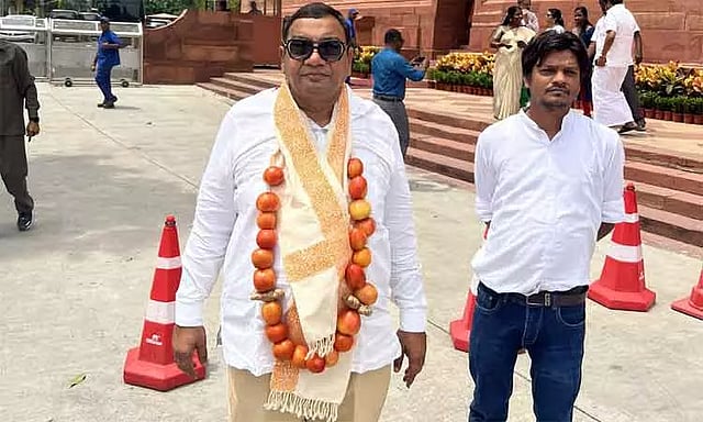 நாடாளுமன்றத்தின் மழைக்கால கூட்டத்தொடரின் கடைசி வாரம் நடைபெற்று வருகிறது. இந்நிலையில், ஆம் ஆத்மி கட்சியின் மாநிலங்களவை எம்.பி. சுஷில் குப்தா, இஞ்சி மற்றும் தக்காளி மாலை அணிந்து, நாடாளுமன்றத்துக்கு நேற்று வந்தார்.