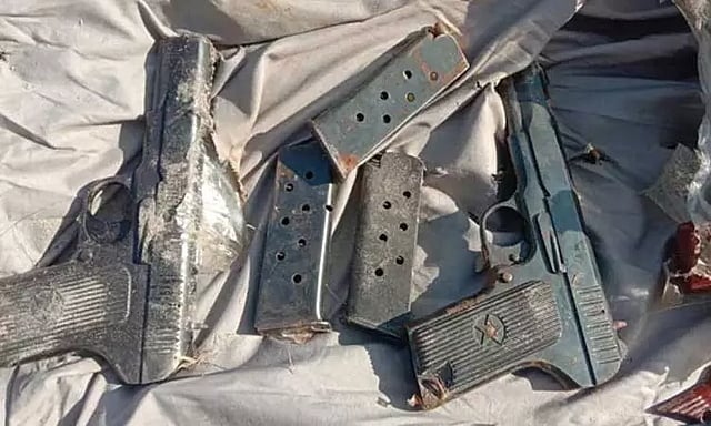 அப்போது அதில் இருந்து இரண்டு ஏகே47 துப்பாக்கிகள், இரண்டு கைத்துப்பாக்கிகள் மற்றும் 40 தோட்டாக்கள் அடங்கிய ஒரு பையை அவர்கள் கண்டுபிடித்ததாக மூத்த அதிகாரி ஒருவர் தெரிவித்தார். இதுகுறித்து அதிகாரிகள் விசாரித்து வருகின்றனர்.