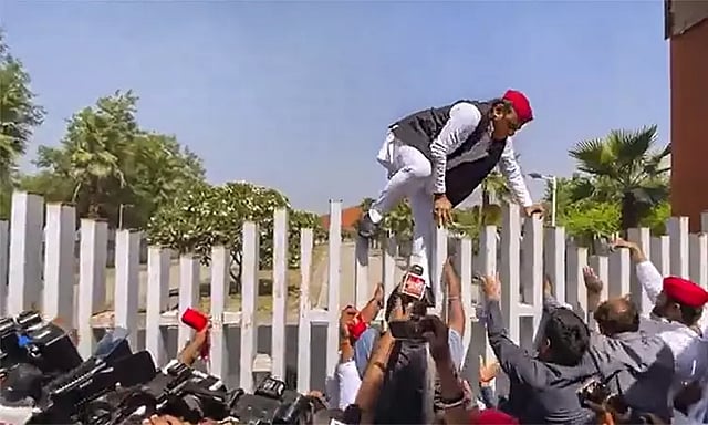 அகிலேஷ் யாதவ் சுவர் ஏறி குதிக்கும் போட்டோ சமூகவலைதளத்தில் அதிகம் பகிரப்பட்டு வருகிறது.