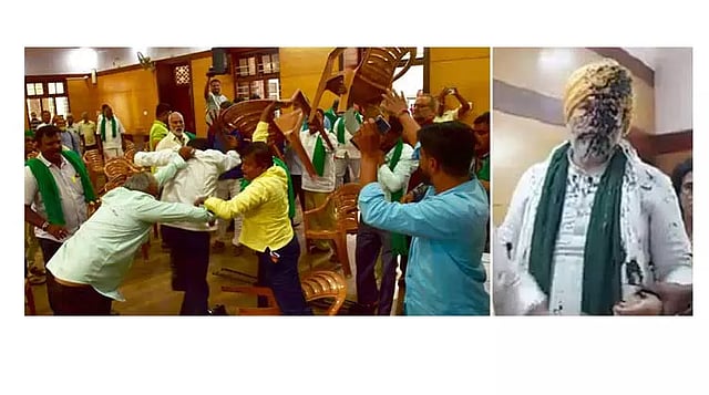அந்த சந்தர்ப்பத்தில் காந்திபவனுக்கு வந்த ஒரு கும்பல், மேடையில் அமர்ந்திருந்த ராஜேஸ் டிகாயத் மீது, அங்கிருந்த மைக்கை எடுத்து திடீரென்று தாக்கினார். அடுத்து வந்த ஒரு நபர் தான் வைத்திருந்த கருப்பு மையை ராகேஸ் டிகாயத் முகத்தில் வீசினார். இதன் காரணமாக அங்கு பரபரப்பு ஏற்பட்டது. மேலும் காந்திபவனில் அமர்ந்திருந்த விவசாயிகளுக்கும், மர்மநபர்களுக்கும் இடையே வாக்குவாதம் உண்டானது. அப்போது அங்கு கிடந்த நாற்காலிகளை எடுத்து தூக்கி வீசினார்கள். ஒருவருக்கொருவர் நாற்காலியால் தாக்கினர்.