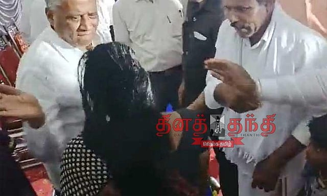 அப்போது ஒரு பெண் ஒருவர், மந்திரியிடம் தனக்கு அரசு சார்பில் நிலம் வழங்க வேண்டும் என்று கெஞ்சியதாக தெரிகிறது. அப்போது கட்டுக்கடங்காத கூட்டதால், அந்த பெண் தள்ளப்பட்டதால் அவர் மந்திரி மீது விழுவது போல சென்றதாக கூறப்படுகிறது. இதனால் ஆத்திரமடைந்த மந்திரி சோமண்ணா, அந்த பெண்ணின் கன்னத்தில் அறைந்ததாக தெரிகிறது.