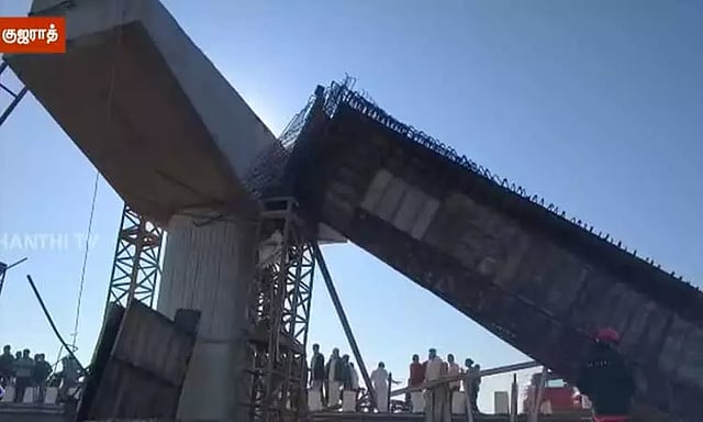 குஜராத் மாநிலம் வல்சாட் நகரில் உள்ள அவுரங்கா ஆற்றின் மீது பாலம் கட்டும் பணி நடைபெற்று வருகிறது. வல்சாட் நகரை அருகில் உள்ள கிராமங்களுடன் இணைக்கும் வகையில் சுமார் 700 மீட்டர் நீளத்திற்கு, ரூ.42 கோடி மதிப்பீட்டில் இந்த பாலம் கட்டப்பட்டு வருகிறது. பாலத்தின் கட்டுமானப் பணியை அடுத்த ஆண்டு ஜூன் மாதம் நிறைவு செய்ய இலக்கு நிர்ணயிக்கப்பட்டுள்ளது.