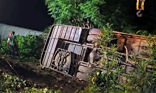 மராட்டிய மாநிலம் மும்பைக்கு அருகில் உள்ள டோம்பிலி நகரை சேர்ந்த பக்தர்கள், கோவில் நிகழ்ச்சிக்காக பந்தர்பூருக்கு பேருந்தில் சென்றுகொண்டிருந்தனர். பேருந்தில் மொத்தம் 42 பேர் பயணம் செய்தனர்.