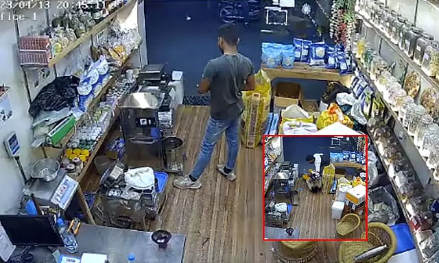 எனினும், முகமூடி கொள்ளையர்கள் கைகளில் துப்பாக்கியுடன் இருந்து உள்ளனர். இதனை பார்த்து, மிரண்டு போன அந்த நபர் மீண்டும் கடைக்குள் ஓடுகிறார். அந்த நபரை பார்த்ததும் முதலில் கொள்ளையர்கள் பின்வாங்கினாலும், பின்னர் மீண்டும் கடை வாசலில் விழுந்து கிடந்த பெண்ணை நெருங்கி உள்ளனர். அவரது கழுத்தில் இருந்த சங்கிலியை பறிக்க முயன்றனர்.