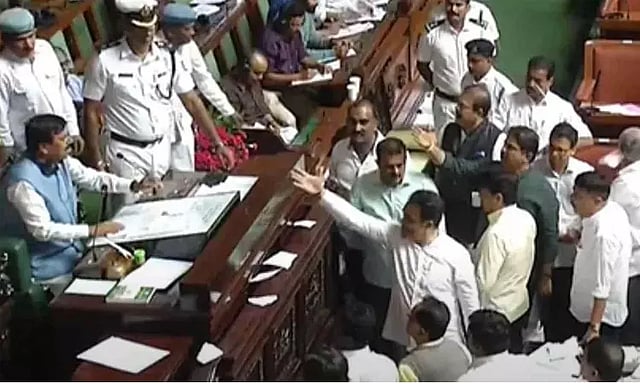 இதனால், ஆத்திரமடைந்த பா.ஜ.க. எம்.எல்.ஏ.க்கள் அவையின் மைய பகுதிக்கு வந்து ஆர்ப்பாட்டத்தில் ஈடுபட்டனர். அவர்கள் மாநில அரசுக்கு எதிராக முழக்கம் எழுப்பினர். சபாநாயகர் மீது காகிதங்களை கிழித்தெறிந்து போராட்டத்தில் ஈடுபட்டனர். இதனால், பரபரப்பு ஏற்பட்டது.